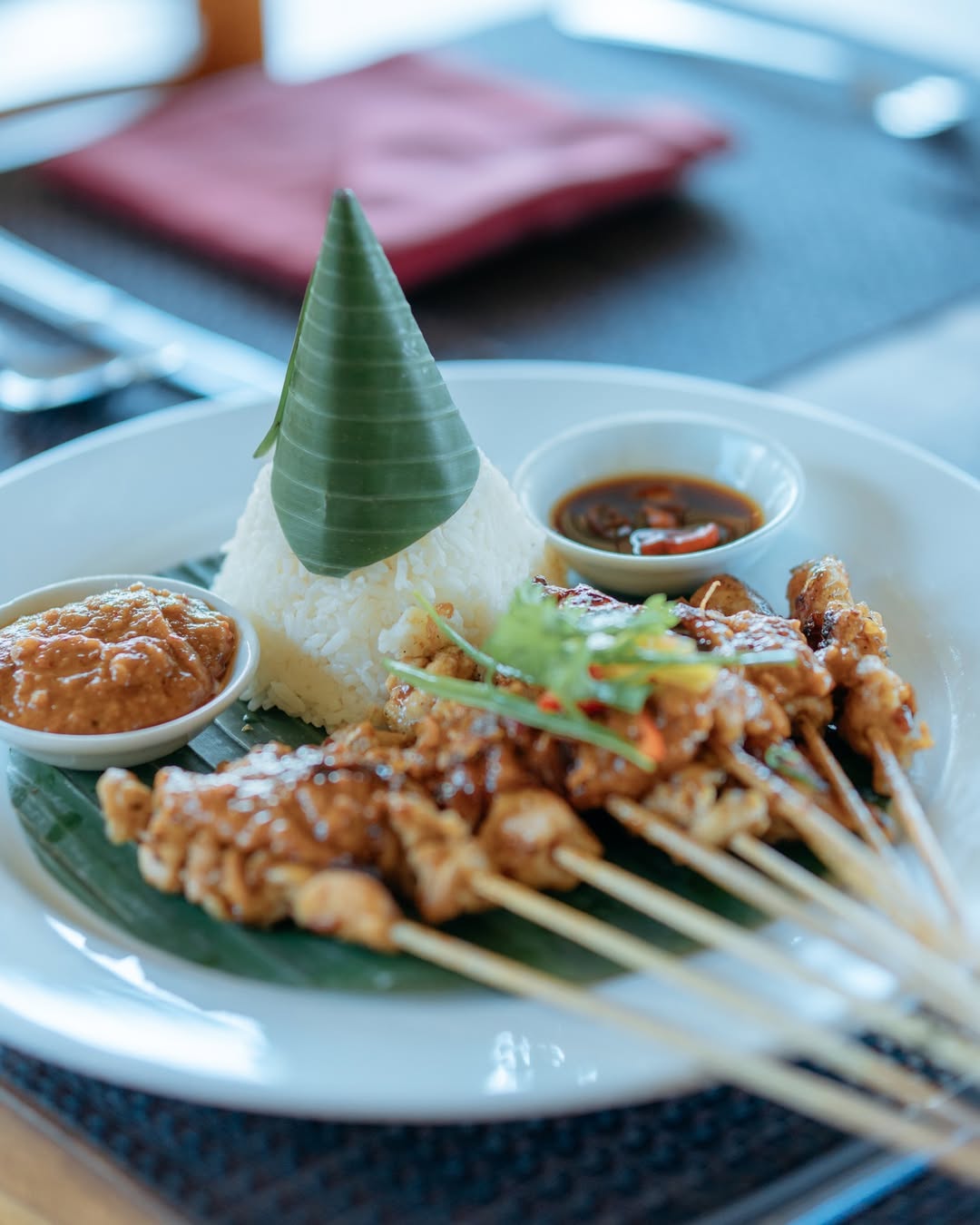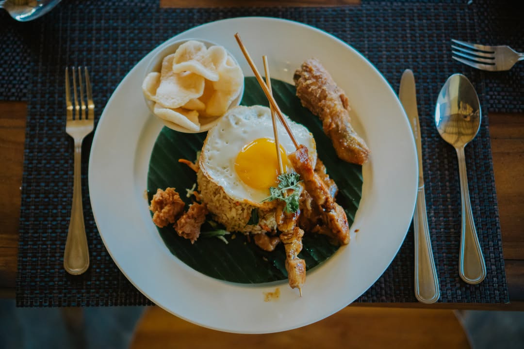 Special fried rice, chicken satay, egg, fried chicken, chill soya pickle, shrimp crackers