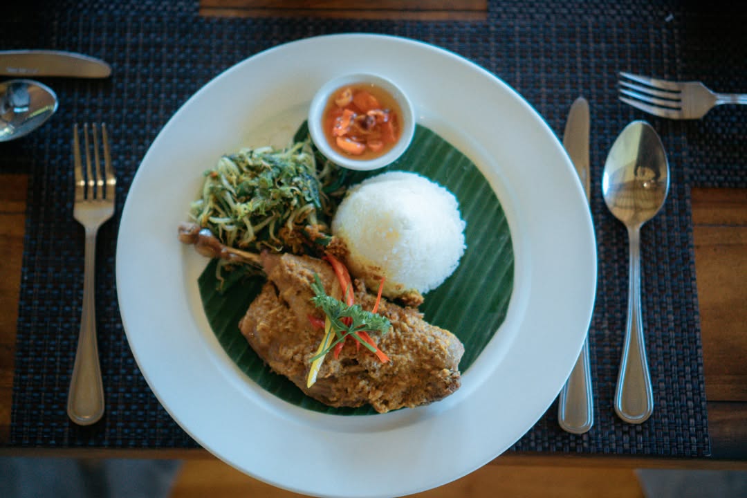 Braised fish with Balinese spice, coconit milk, jukut urab, steam rice and sambal matah