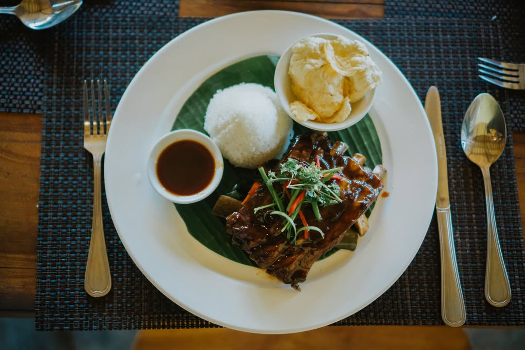 Balinese risttafel, steam rice, egg, chicken satay, jukut urab, sambal