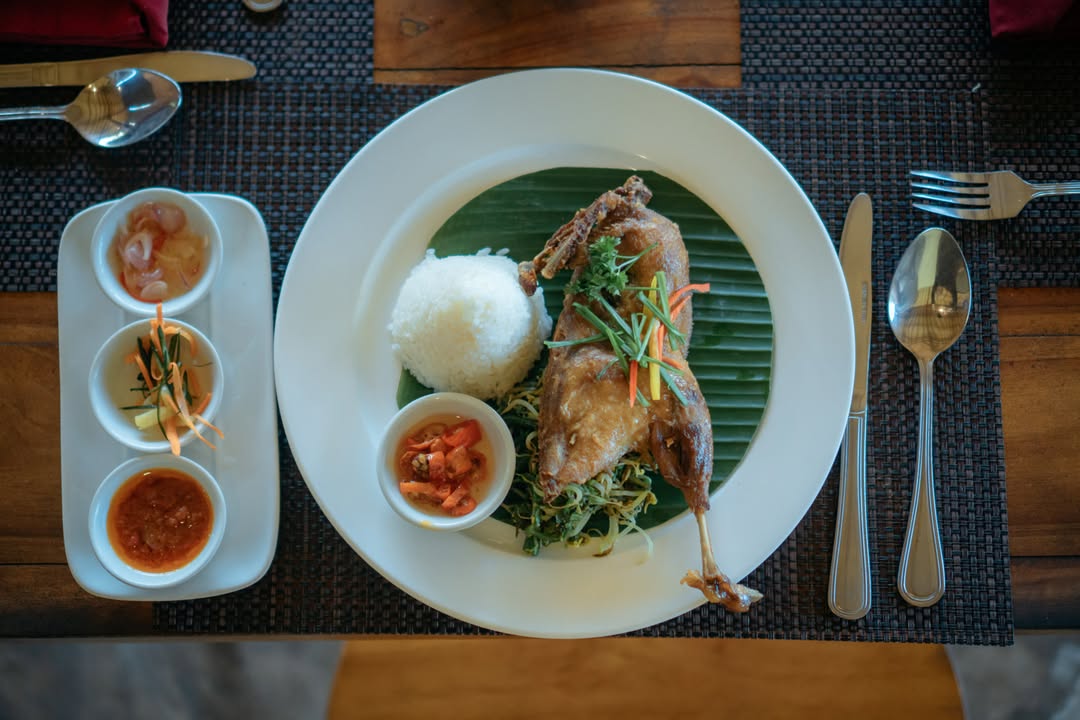 Roasted duck with balines spice, jukut urab sambal and steam rice